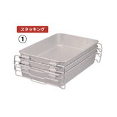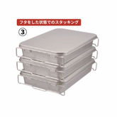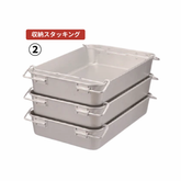 アルミ製のコンテナです。特殊な形状のアームと別売のフタを使用して【スタッキング】【収納スタッキング】【蓋付き収納スタッキング】と切り替えてお使いいただけます。鮮魚・野菜・食材の保管には勿論ですが、調理器具などの整頓にも最適です。