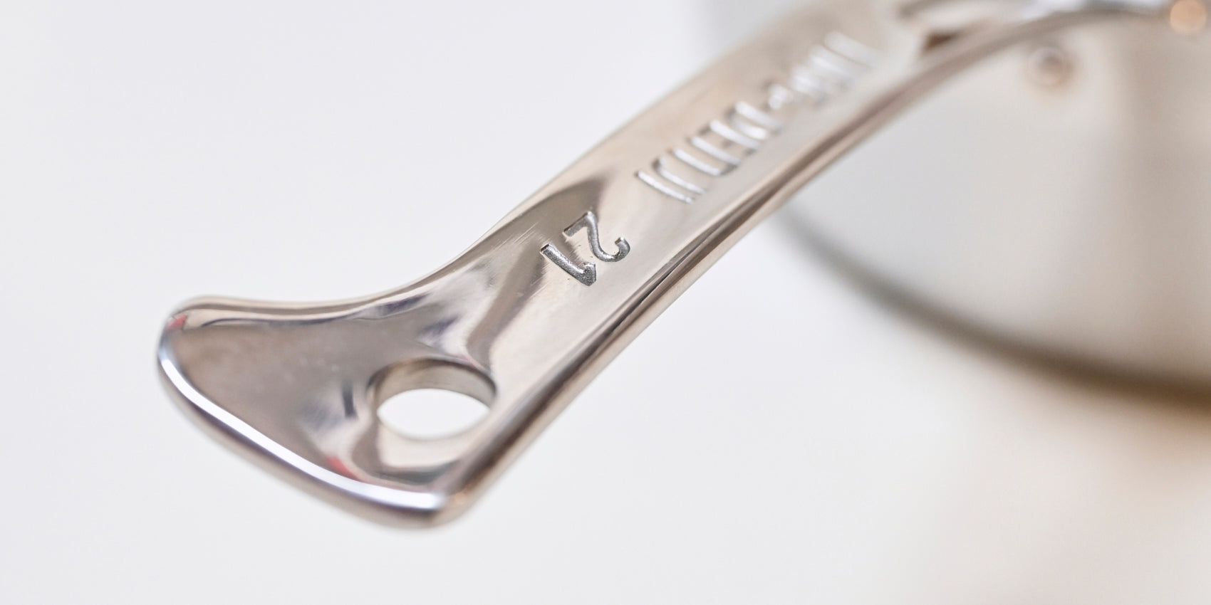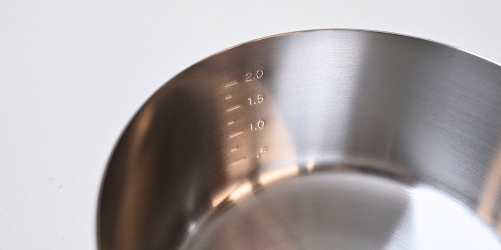 - メジャーのメモリが刻印: シェフからの提案を受け、計量カップを使わなくとも分量がわかるように改善。鍋の側面にメモリを刻印することで、調理の手間を省き、もっと使いやすい鍋に。